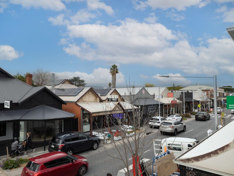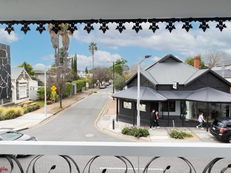 The building features two spacious levels, each filled with beautiful natural light and light timber floorboards throughout. The upper level which sits above the newly renovated hairdressing salon Fon & Co boasts elegant stained-glass doors that open onto a tiled balcony, offering picturesque views of King William Road and beyond.