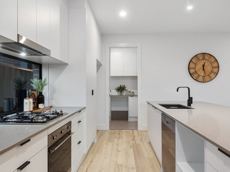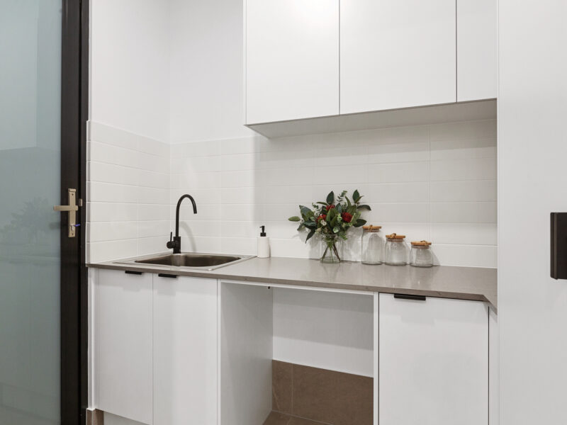 For those who love laundry designs, this well thought out laundry / walk in pantry, fits the space perfectly with ample cupboard and bench space and provision for a front loader washing machine, a provision for a wall dryer and a built in pantry.