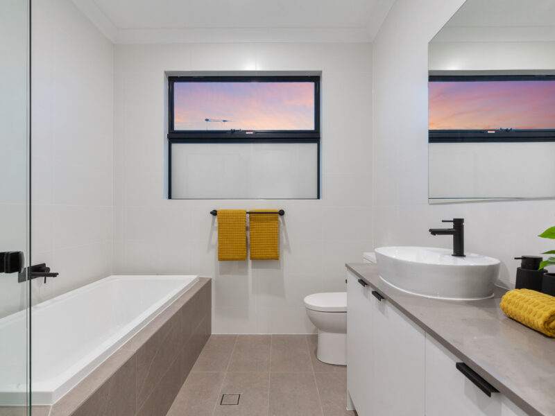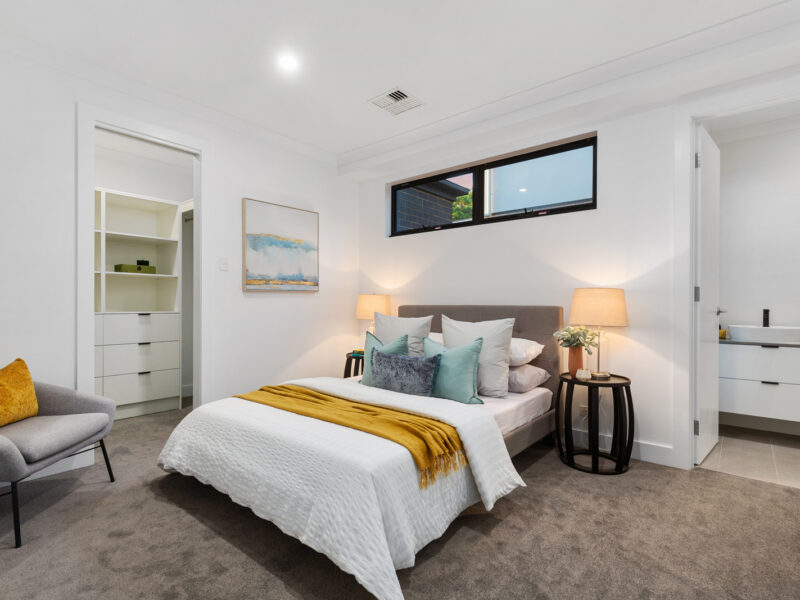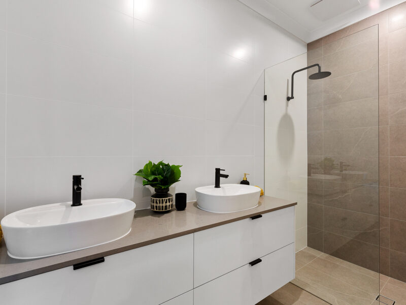 The master bedroom includes a beautiful spacious walk in robe and ensuite. The ensuite has floor to ceiling tiles, a glass shower screen, a double basin floating vanity with multiple cupboard storage and high quality Phoenix tapware and fixtures.