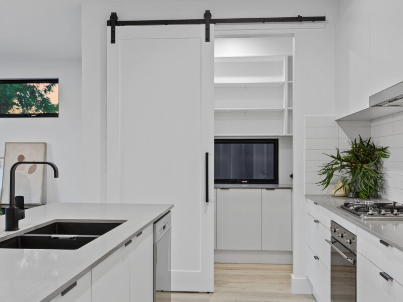 You’ll love the kitchen, with the architecturally designed layout that boasts multiple cupboards giving lots of storage and bench space, black Phoenix fixtures, stainless steel Smeg appliances including a gas cooker, electric oven, dishwasher, range hood. The stone island bench has a black sunken double sink and large walk in pantry with a modern barn sliding door, fixed splashback window, multiple cupboard and lots of bench space.