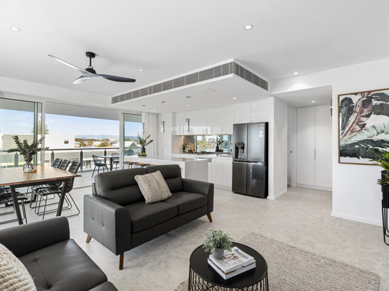 Next you’ll find a hidden Laundry, tucked away that includes a separate washing machine and dryer along with 2 large bedrooms. Bedroom 3 has a built in robe and 2 single beds with natural lighting entering throughout the room. Bedroom 2 boasts a king bed and built in robe with access to the balcony.