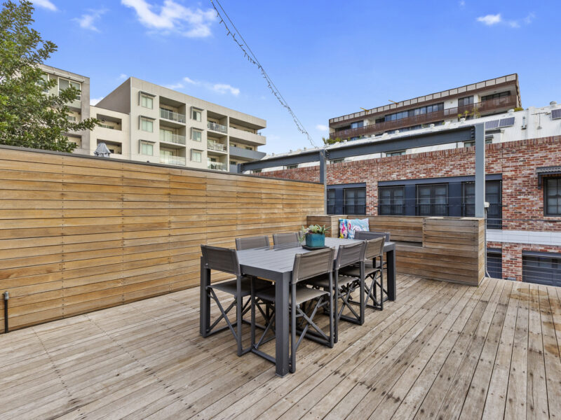 – Main entertaining decked terrace with built-in seating