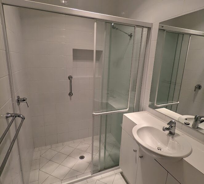 Enjoy the modern bathroom with floor-ceiling tiles.