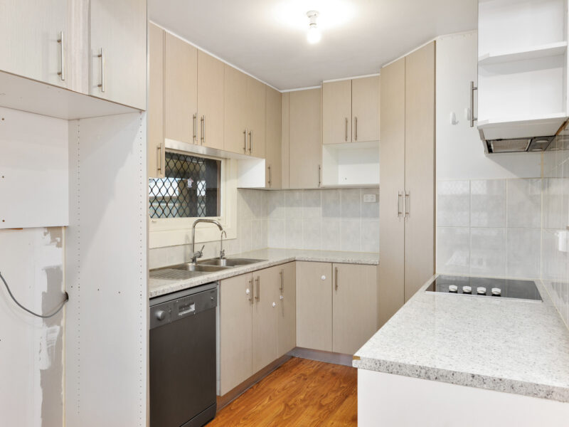 – Modern kitchen with stainless steel dishwasher, built-in pantry & electric cooktop